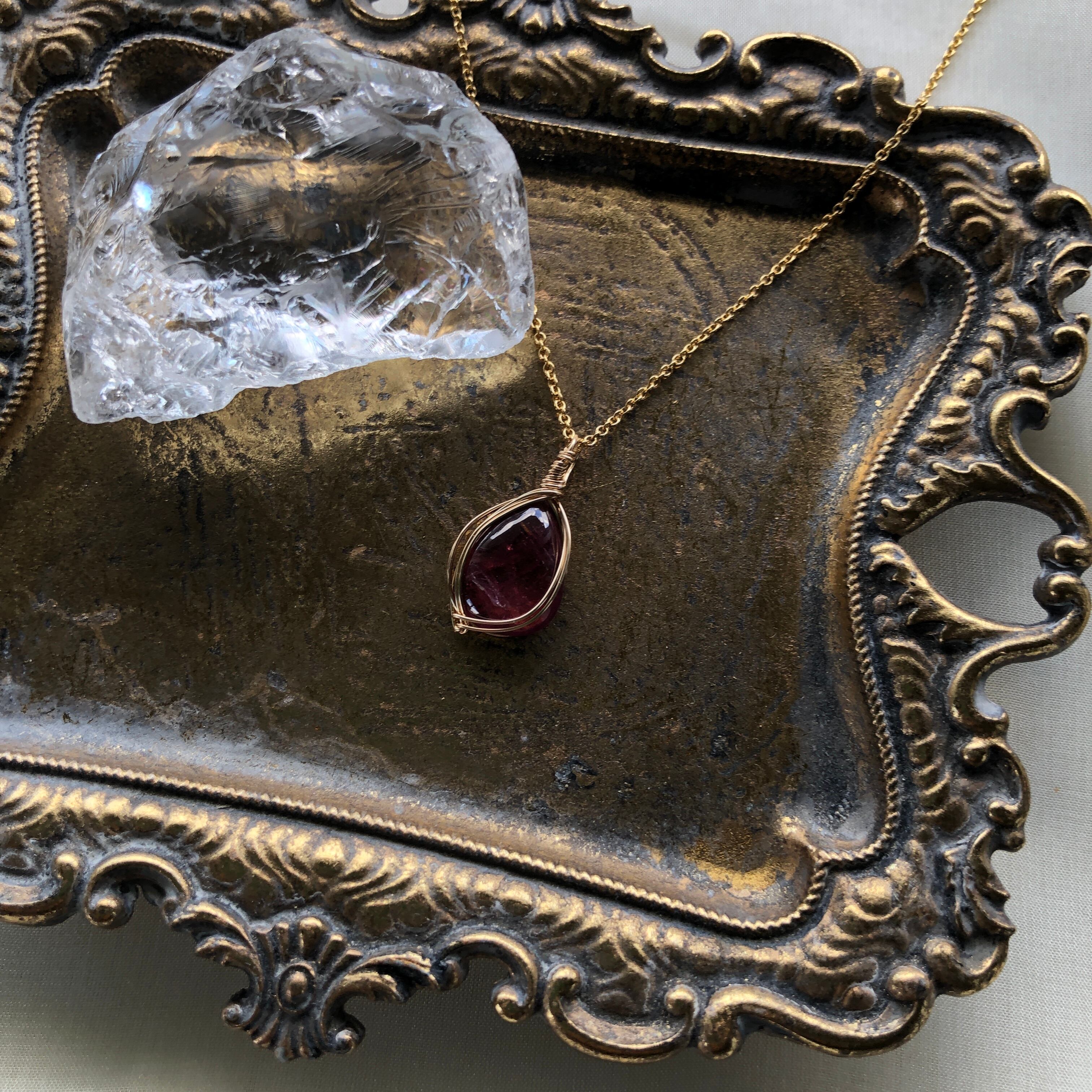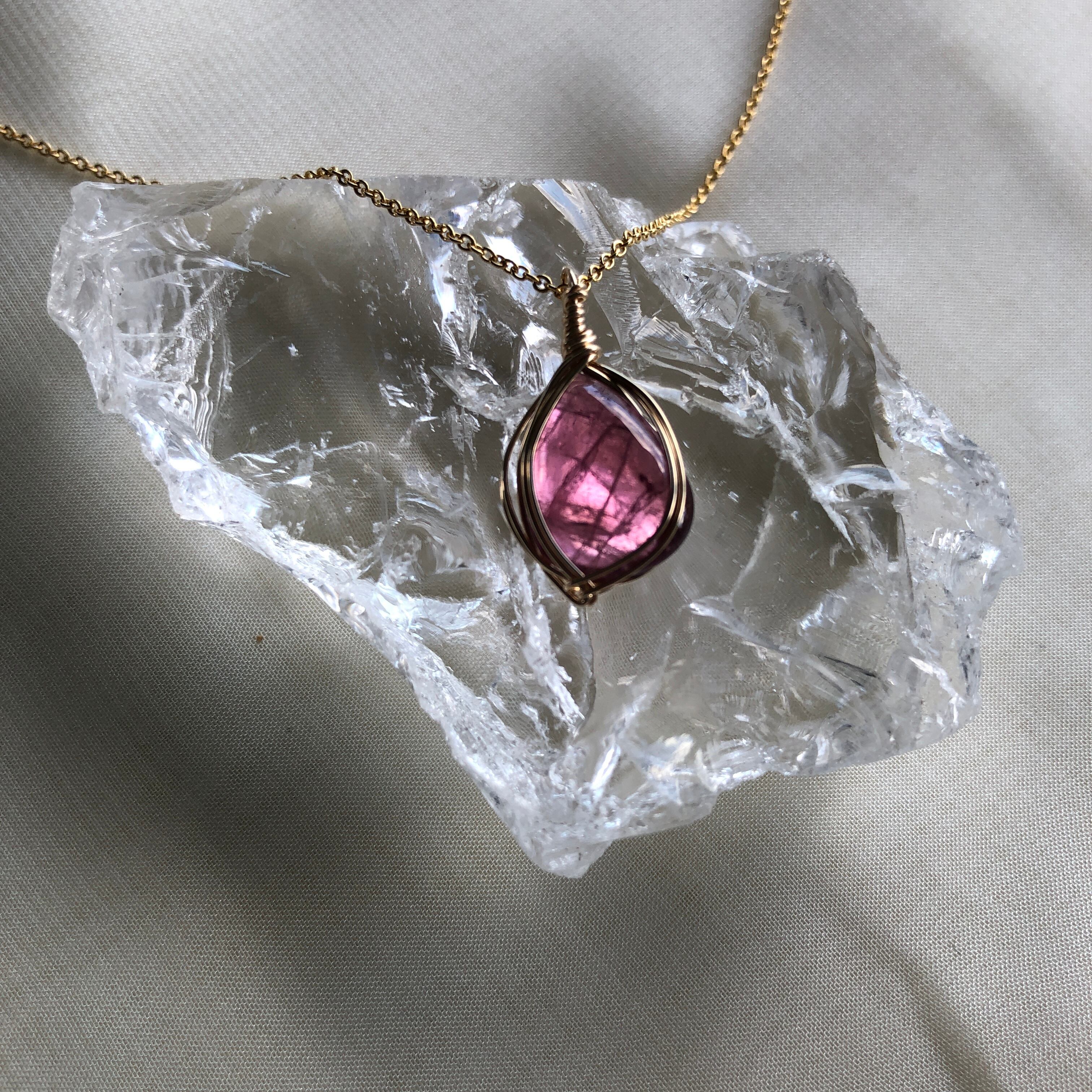 透明感のある、やや赤みの強いピンクトルマリンをワイヤーで包んだネックレスです。
