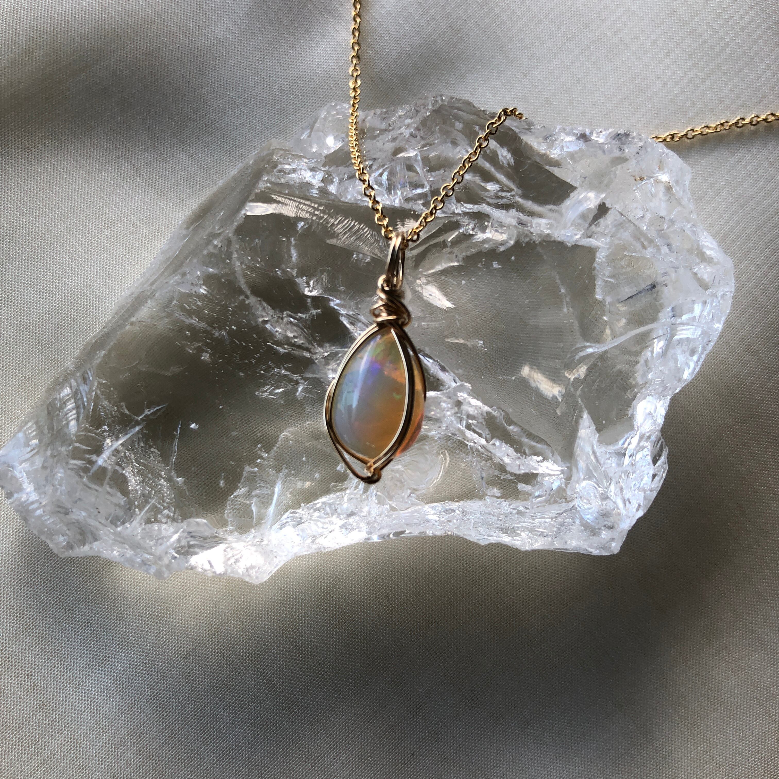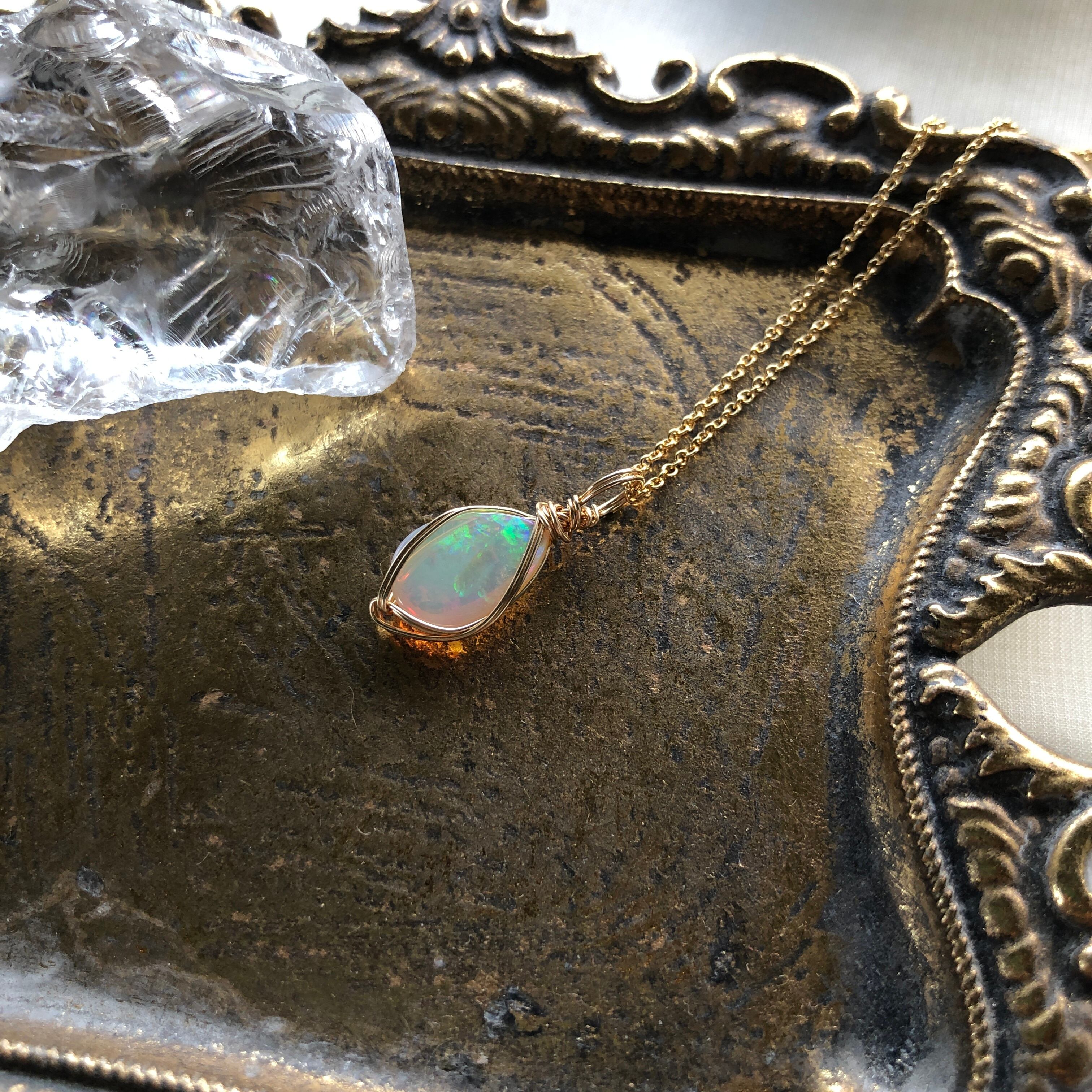 エチオピア産のプレシャスオパールをワイヤーで包んだネックレスです。